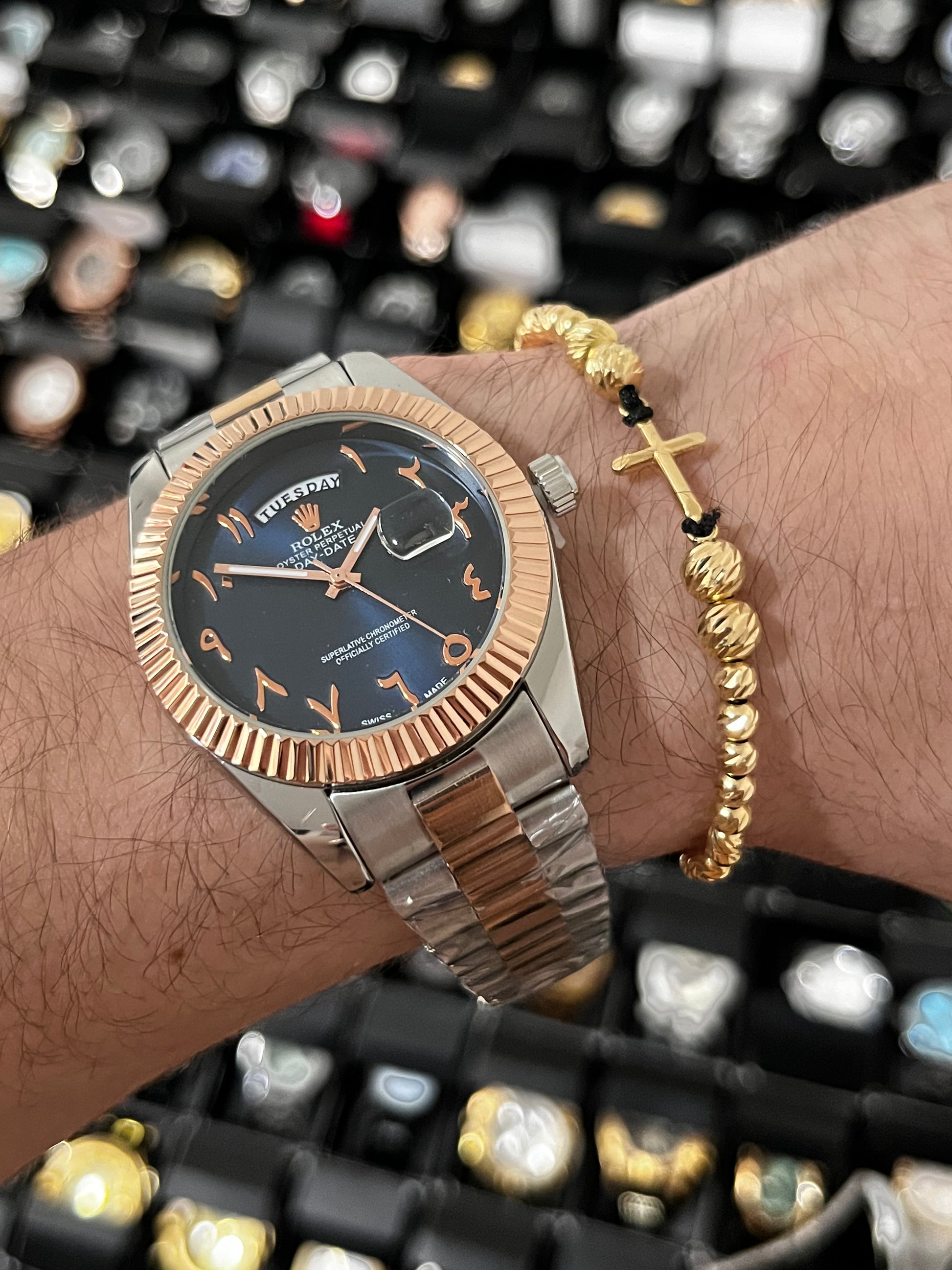 RX DTJST DD ARAB / BISEL RELIEVE / BICOLOR ORO ROSA FONDO AZUL OSCURO